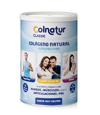 Producto alimenticio formado exclusivamente por proteína hidrolizada de colágeno COLNATUR,natural y pura, con vitamina C. La proteína colágeno contribuye al mantenimiento normal de huesos y músculos, mientras que la vitamina C contribuye a la formación normal de colágeno para el funcionamiento normal de huesos, cartílagos, articulaciones, encías, dientes y piel.